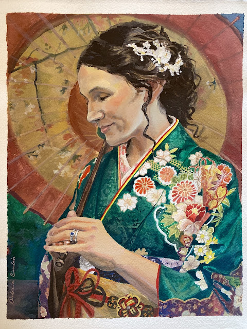 I think this is about 20 hours of work. It was a challenge painting so small but it also was enjoyable to see progress so quickly! I adore the deep green of her kimono and vibrant flowers! Even her pose is just so beautiful! So thank you Lisa! I hope you enjoy your painting when it arrives in Japan!